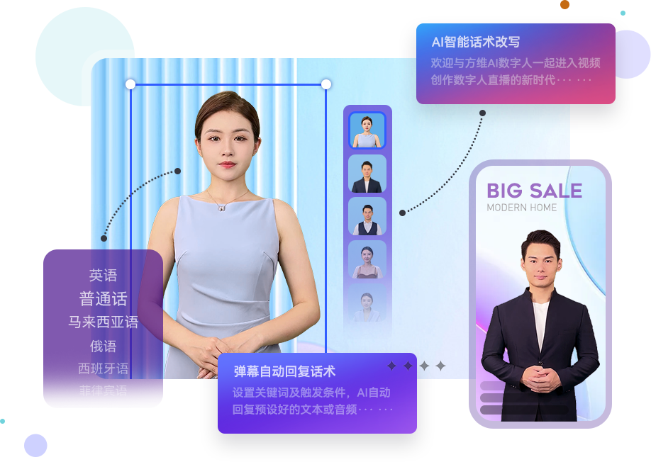 AI數(shù)字人定制 / 數(shù)字人直播 / AI短視頻生產(chǎn) / AI語音合成 / 場(chǎng)景化模板 / 智能腳本